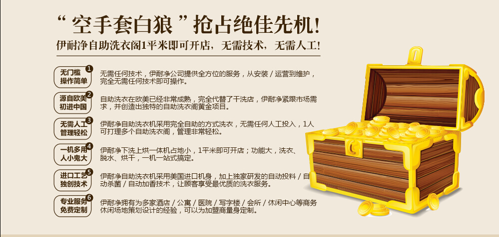 源自歐美初進:自助洗衣在歐美已經(jīng)非常成熟,完代替了干洗店,伊耐凈緊跟市場需求,并造出殊的自主洗衣閣黃金項目。